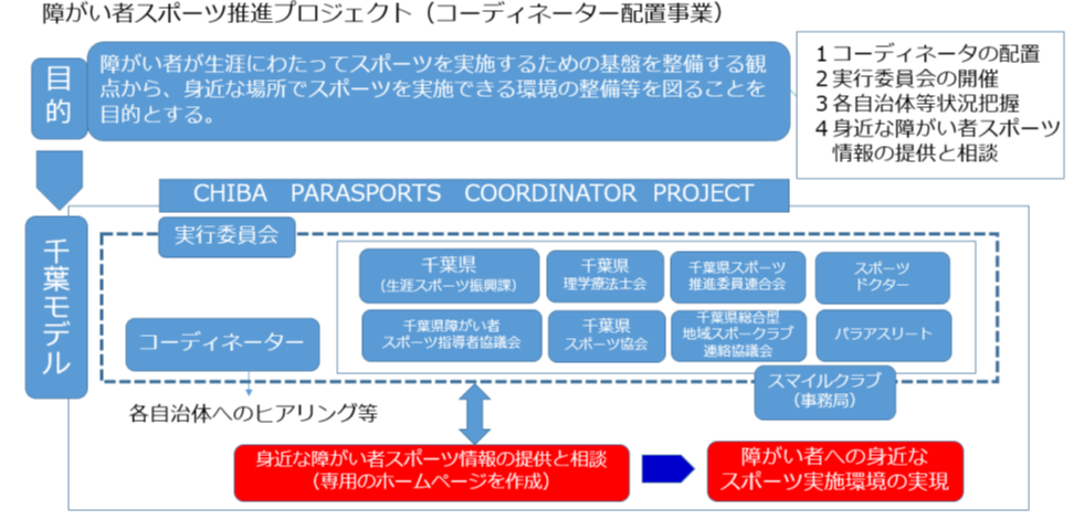この事業は、福祉・教育・スポーツ関係団体等との連携を中核的に担うコーディネーターを配置し、千葉県および県内各自治体の、福祉・教育・スポーツ関係団体等と連携し、各自治体、総合型地域スポーツクラブ、施設等における障がい者を対象としたスポーツ提供体制の把握等を整理し、情報共有をおこない、障がい者が生涯にわたって身近な場所でスポーツを楽しめる環境の整備等を図ることを目的とする事業です。事業全体図としては、下記内容となります。