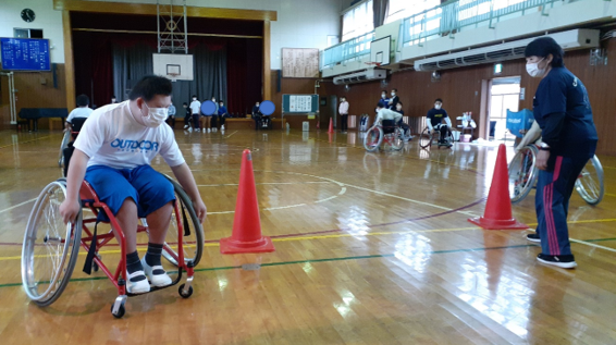 2022年10月13日(木)に千葉県立夷隅特別支援学校にて、車いすバスケの出前授業(スポーツ庁委託事業)を開催しました。当日は、千葉ホークスから添田智恵選手(パラリンピック出場)、植木隆人選手(アジアパラ出場)2名に講師として来ていただき、車いすに乗ってのゲームやシュートなどを体験しました。この日を楽しみに待ってくれていた生徒達は、時間が進むとともに車いす操作やシュートも上手になってきました。