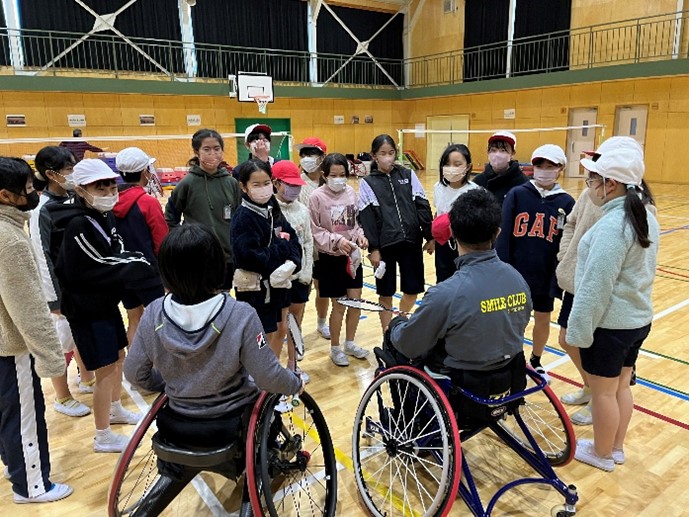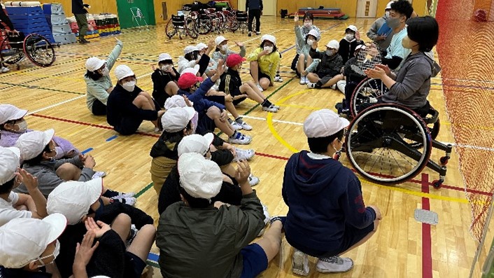 授業では初めに小倉選手と大浜選手によるデモンストレーションとパラバドミントンの説明が行われました。その後実際に競技用車いすに乗車し氷鬼やパラバドミントンの体験を行いました。その後小倉選手、大浜選手と児童がペアになってダブルスのゲームを行い大いに盛り上がりました。最後の質問タイムでは積極的に手を上げる児童が多く、小倉選手や大浜選手の色々な話を聞くことが出来ました。挨拶後にも選手たちのもとへ話しかけに行く児童もたくさんいました。